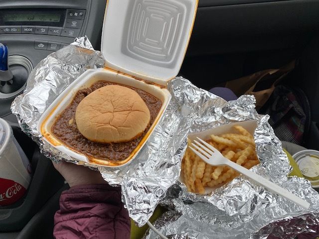 Our first trip through Joplin, MO, saw us making a quick stop for Carrie's first Hardee's dinner. On our way back through we thought we'd try the jewel of Joplin, Fred & Red Chili. Folks rave about their "Spaghetti Red," but we wanted to get back on the road -- I (driving) got a cheeseburger and fries. Carrie figured she'd better try the chili and ordered a chili cheeseburger. We figured it'd be garnished with chili, but Fred & Red does not skimp.